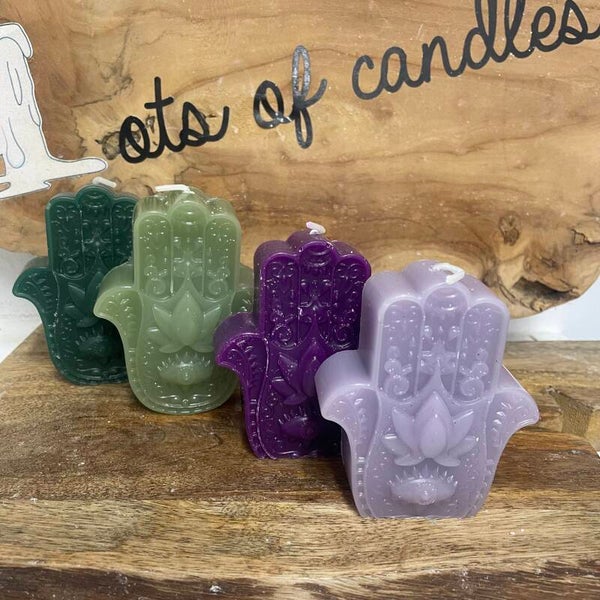 Een leuke kaars die de vorm heeft van een Hamsa handje. Ze zijn gemaakt van Parafine /stearine en hebben een lange brandtijd.